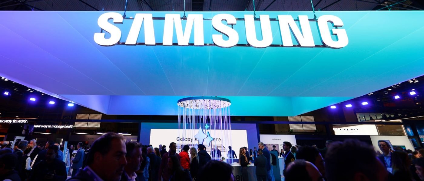 The Samsung logo is on display at their pavilion during the Mobile World Congress in Barcelona, Spain, on February 28, 2024. (Photo by Joan Cros/NurPhoto via Getty Images)