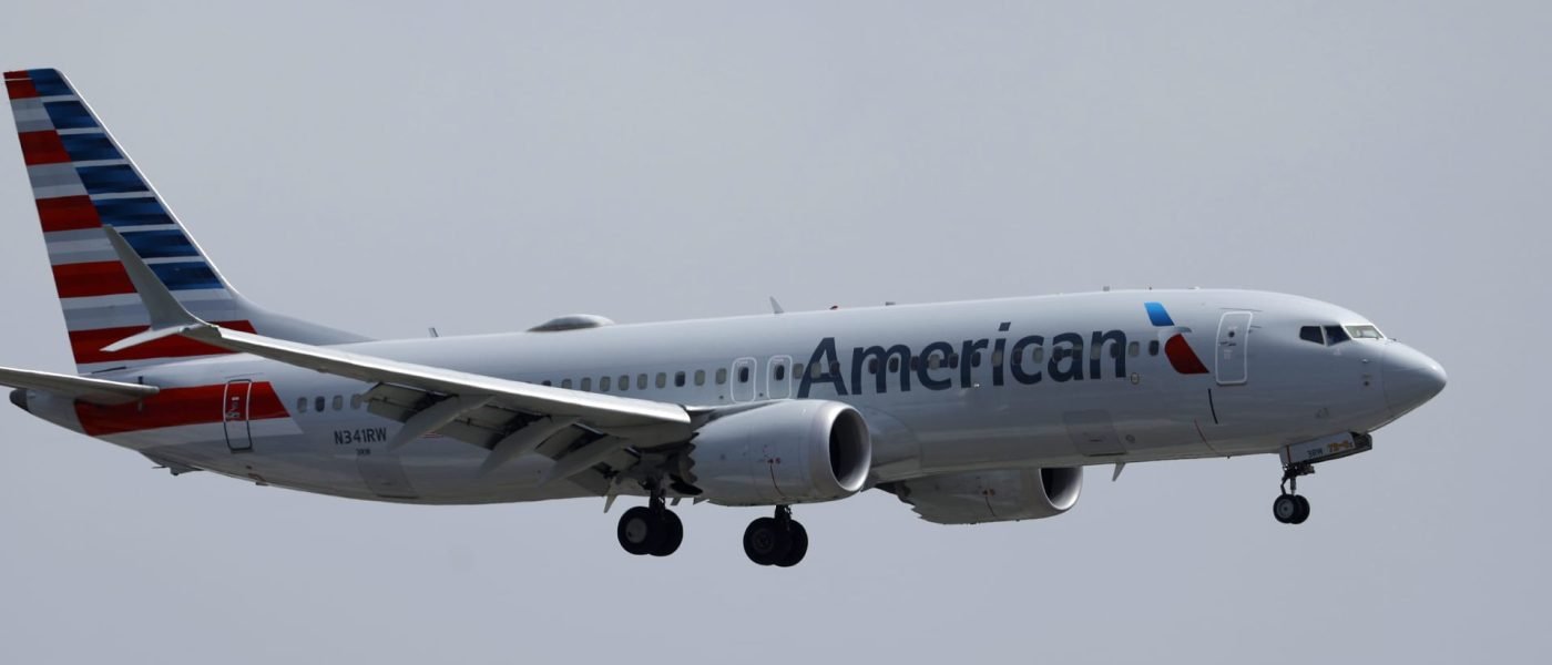 An American Airlines Boeing 737 MAX 8 aircraft approaches San Diego International Airport for a landing from Phoenix on June 28, 2024 in San Diego, California.