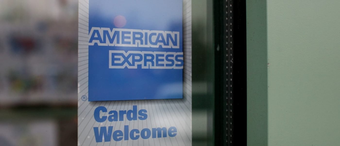 A sign showing the American Express logo is seen outside of a restaurant in Des Plaines, Illinois.