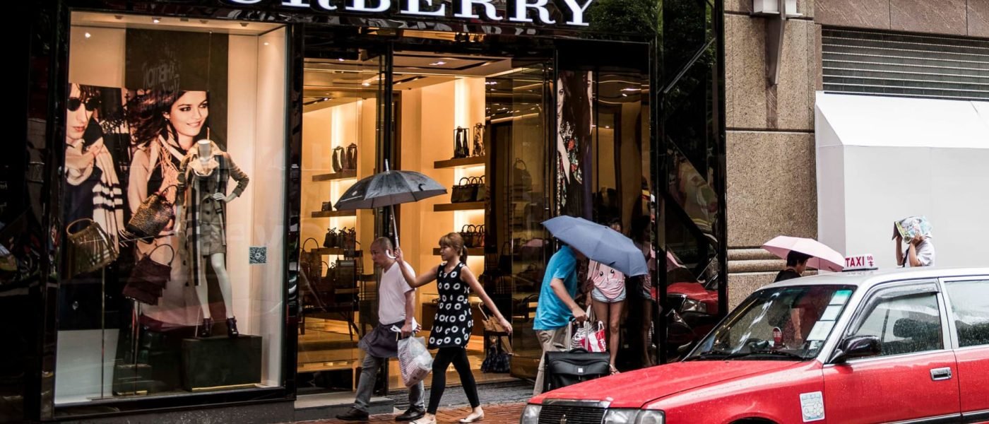 Pedestrians walk past a Burberry Group Plc store, left, in the Causeway Bay shopping district of Hong Kong.