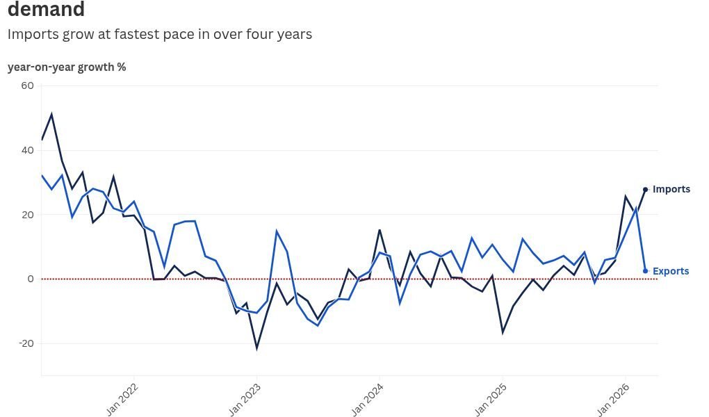 Imports surged 27.8% in March from a year ago, marking the strongest growth since November 2021, sharply beating expectations for a 11.2% growth, and quickening from 19.8% in the prior two months.