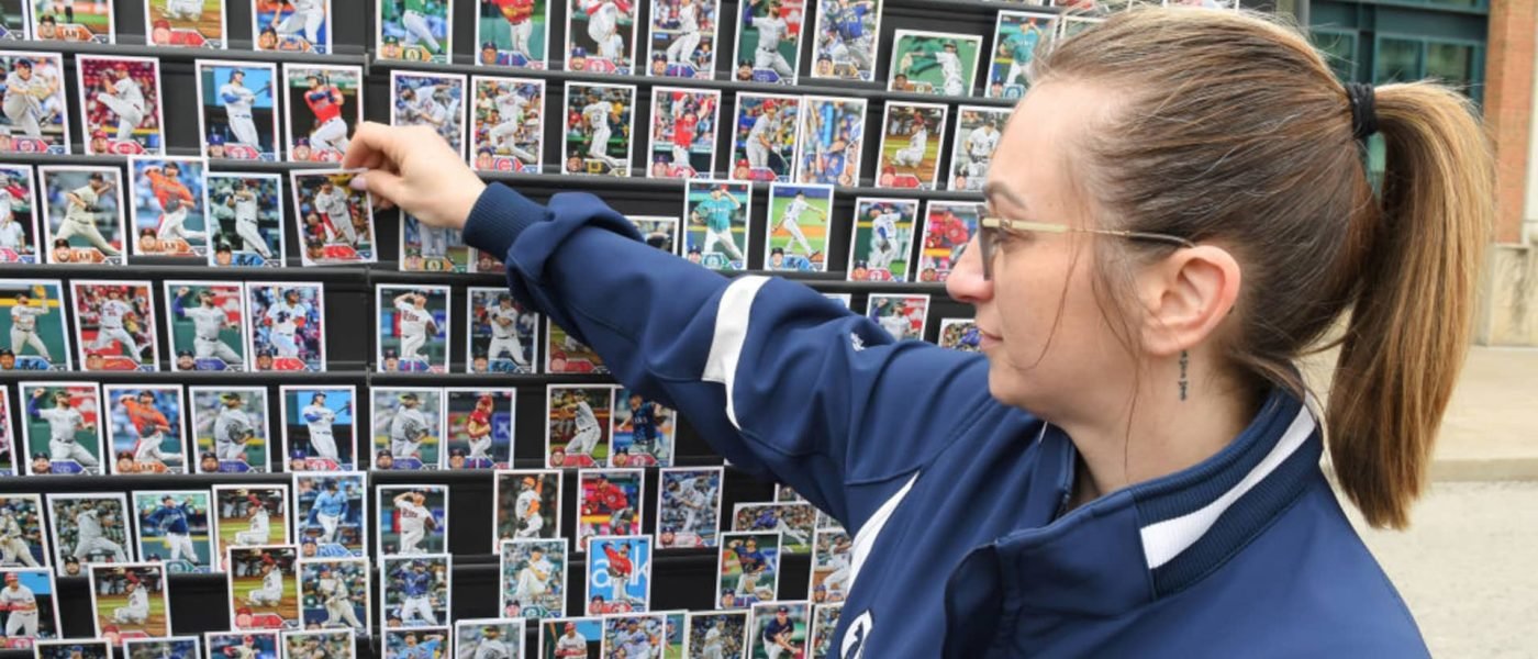 DETROIT, MI – APRIL 29: A fan trades a baseball card on the trade wall during the 2023 Topps Truck Tour promotion outside of Comerica Park during game one of a doubleheader between the Baltimore Orioles and the Detroit Tigers at Comerica Park on April 29, 2023 in Detroit, Michigan. The Tigers defeated the Orioles 7-4. (Photo by Mark Cunningham/MLB Photos via Getty Images)