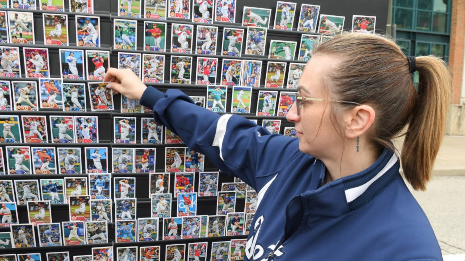 DETROIT, MI – APRIL 29: A fan trades a baseball card on the trade wall during the 2023 Topps Truck Tour promotion outside of Comerica Park during game one of a doubleheader between the Baltimore Orioles and the Detroit Tigers at Comerica Park on April 29, 2023 in Detroit, Michigan. The Tigers defeated the Orioles 7-4. (Photo by Mark Cunningham/MLB Photos via Getty Images)