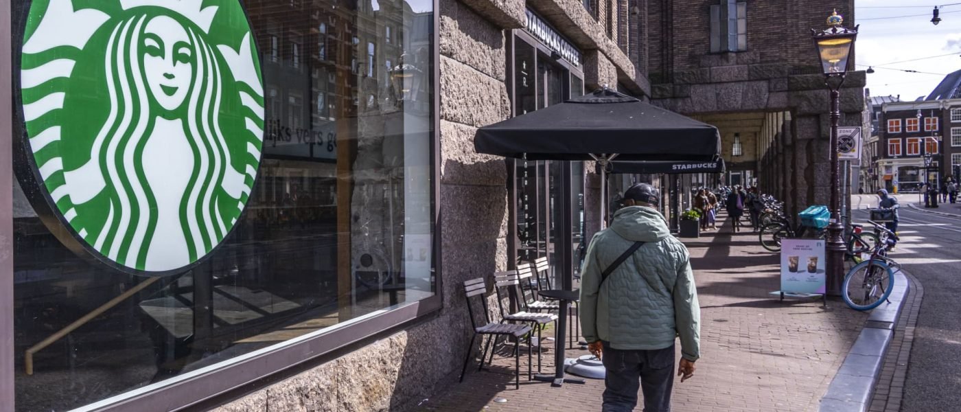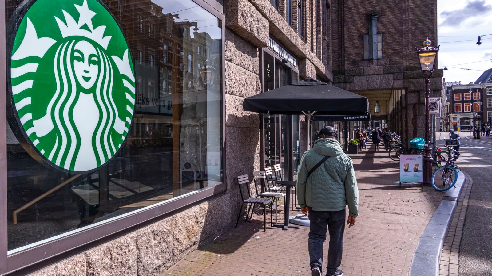A store of Starbucks Coffee shop chain located in Amsterdam city center with people sitting inside, enjoying a coffee after shopping in the cafe, while others are walking by.