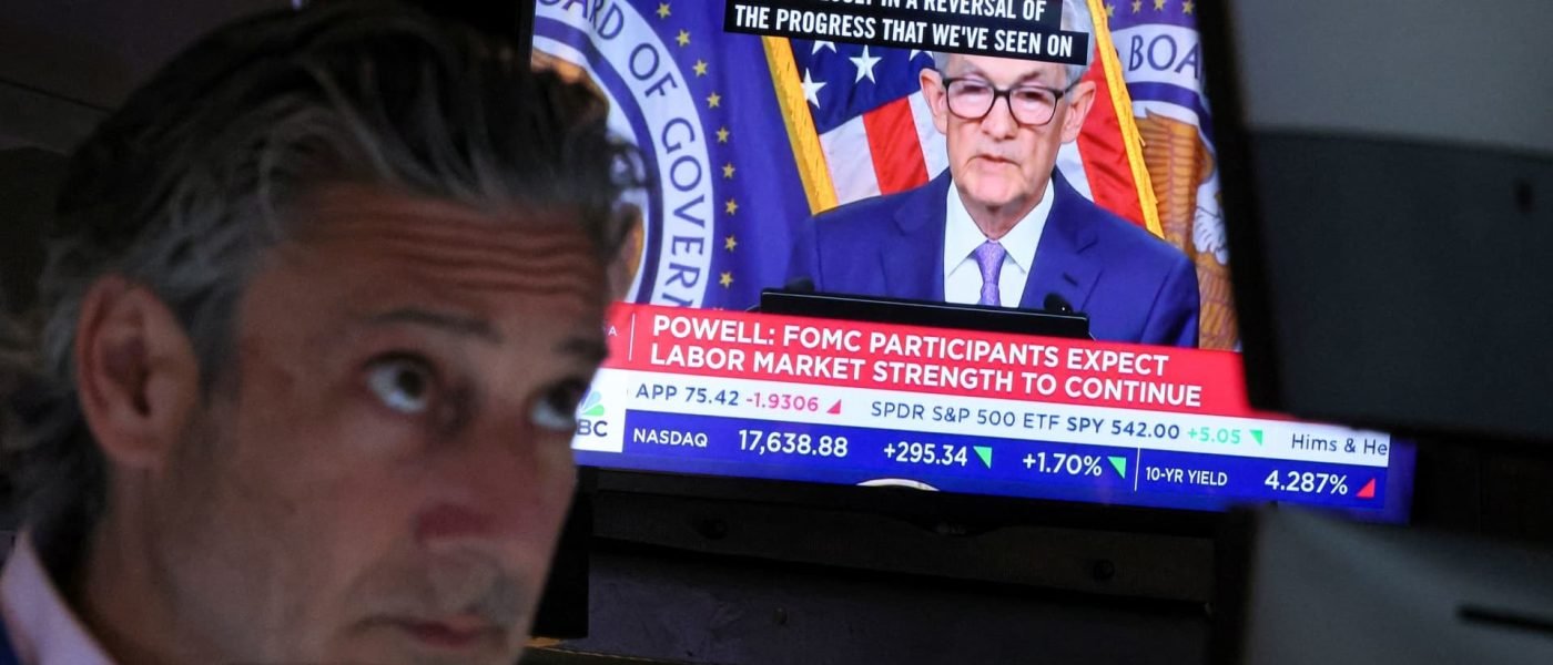 A trader works, as a screen broadcasts a news conference by U.S. Federal Reserve Chair Jerome Powell following the Fed rate announcement, on the floor of the New York Stock Exchange in New York City, U.S., June 12, 2024.