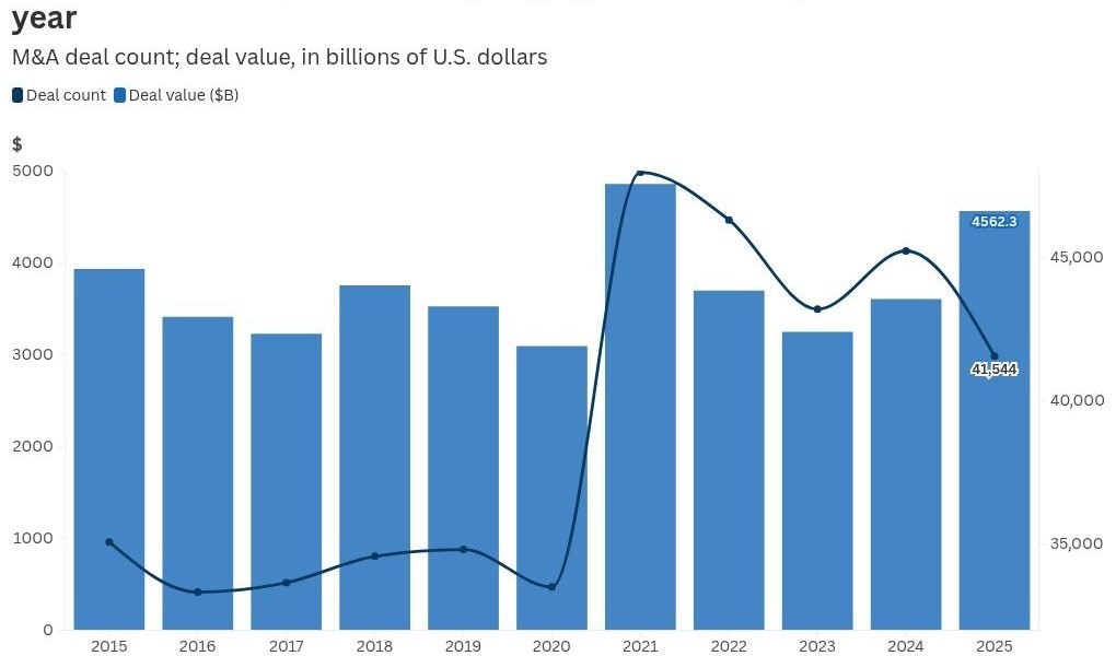 Despite a sluggish start as Trump’s sweeping tariffs early last year briefly scuttled acquisitions and new public listings, the total value of deal-making activity surged nearly 40% to a record of $4.9 trillion in 2025, according to private market intelligence firm Pitchbook.